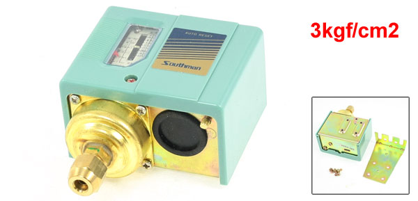 Differential 0.5-2kgf/cm2, 7-30Lb/in2, 7-30PSI Thread Diameter 11mm Overall Size 8 x 4.6 x 10cm/ 3.1" x 1.8" x 3.9" (L*W*H) Color Light Forest Green, Gold Tone Material Metal Net Weight 408g Package 1 x Pressure Switch