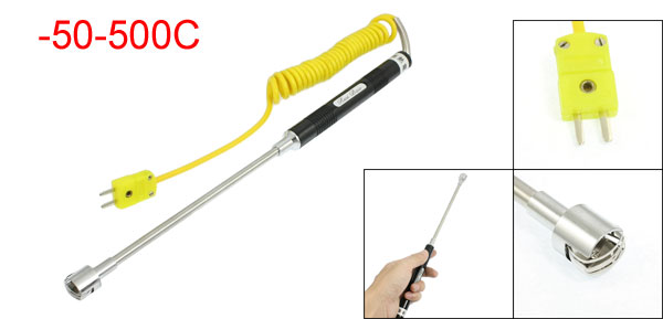 Product Name Thermocouple Probe Type K Type Material Electronic Parts, Plastic Main Color Yellow, Silver Tone Temperature Range -50-500C Fork Terminal Spacing 5mm/ 0.197" Probe Diameter 6mm/ 0.24" Probe Length 17cm/ 6.69" Handle Size 130 x 15mm/ 5.12" x 0.59"(L*Dia) Head Diameter 15mm/ 0.59" Cable Length 12cm/ 4.72"(Not Stretch) Total Length 60cm/ 23.6"