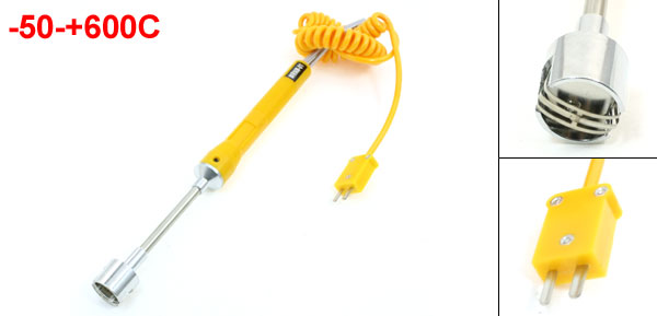 Product Name Thermocouple Probe Model WRNM-01 Type K Type Material Electronic Parts, Plastic, Metal, Rubber Main Color Yellow, Silver Tone, Black Temperature Range -50-+600C Fork Terminal Spacing 5mm/ 0.2" Probe Diameter 6mm/ 0.24" Probe Length 22cm/ 8.7" Handle Size 12 x 1.5cm/ 4.7" x 0.59"(L*Dia) Head Diameter 23mm/ 0.91" Cable Length 44cm/ 17.3"(Not Stretch) Total Length 70cm/ 27.6"