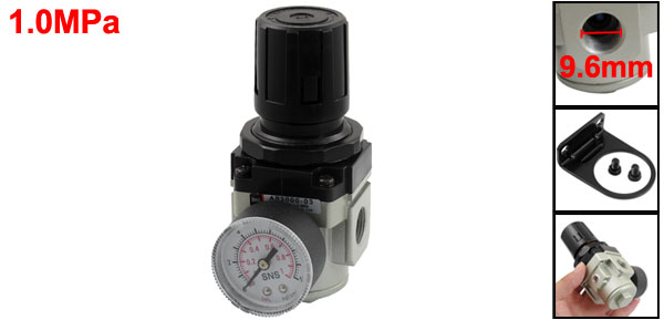Product Name Pressure Regulator Model AR3000-03 Max. Pressure 1.0MPa ADJ.Range 0.05~0.85kgf/cm2 Working Media Air Joint Female Thread Dia 14mm/ 0.47" Gauge Thread Diameter 9.6mm (G1/4) Gauge Range 0~1 MPa Valve Total Size (Approx) 5.2 x 5.2 x 12cm/ 2.0" x 2.0'' x 4.7'' (L*W*H) Pressure Guage Size 4.2 x 3.6cm/ 1.6" x 1.4" (D*H) Stand Size 6.6 x 5.2 x 2cm/ 2.5" x 2" x 0.8" (L*W*H) External Material Metal, Plastic Main Color Black, Gray, Silver Tone Total Weight 460g Package Content 1 x Pressure Regulator