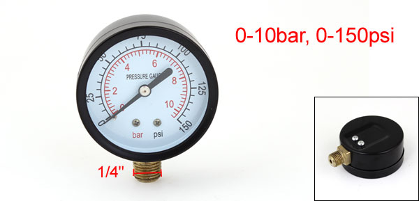 Product Name Pressure Gauge Material Metal, Plastic Type Dial Type Pressure Range 0-10bar, 0-150psi Male Thread Diameter 1/4" PT Case Size (Approx) 60 x 28mm / 2.36" x 1.10" (D*T) Color Clear, Black Weight 128g Package Content 1 x Compressor Gauge - Reviews