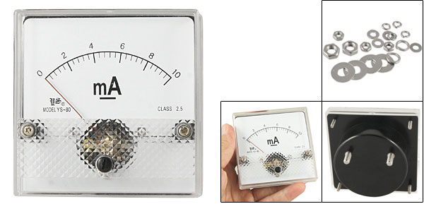 DC Current Panel Meter Model No. YS-80 Scale Range DC 0~10mA Accuracy Class 2.5 Back Screw Diameter 5mm/ 0.2" & 3mm/ 0.12" Back Round Base Dia. 64mm/ 2.5" Panel Size 8 x 8 x 1.3cm/ 3.1" x 3.1" x 0.5" (L*W*T) Overall Depth 4.8cm/ 1.9" Color White & Black Main Material Plastic & Metal Net Weight 106g Package 1 x DC Current Panel Meter - Reviews