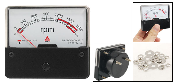 RPM Panel Meter Model No. DE 670 Scale Range 0-1800RPM Voltage AC10V Current 1mA Frequency 50/60Hz Accuracy Class 2.5 Back Screw Diameter 3.9mm/ 0.15" & 2.6mm/ 0.1" Back Round Base Dia. 51mm/ 2" Panel Size 7 x 6 x 1.2cm/ 2.7" x 2.3" x 0.5" (L*W*T) Overall Depth 3.5cm/ 1.4" Color White, Black Main Material Plastic & Metal Net Weight 77g Package 1 x RPM Panel Meter - Reviews