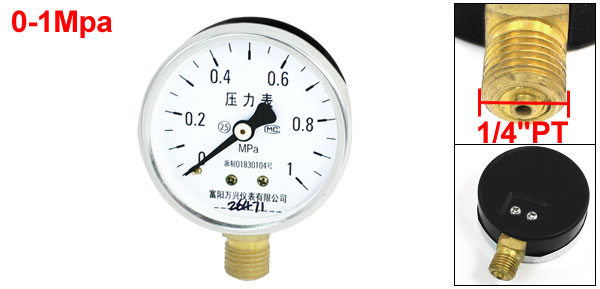 Product Name Pressure Gauge Scale Range 0-1Mpa Scale Accuracy 2.5 Total Size 8 x 6 x 2.6cm/3.1" x 2.4" x 1"(L*D*T) Male Thread Dia 13mm/ 1/4"PT External Material Metal, Plastic Color Black, White, Gold Tone Net Weight 110g Package Content 1 x Pressure Gauge - Reviews