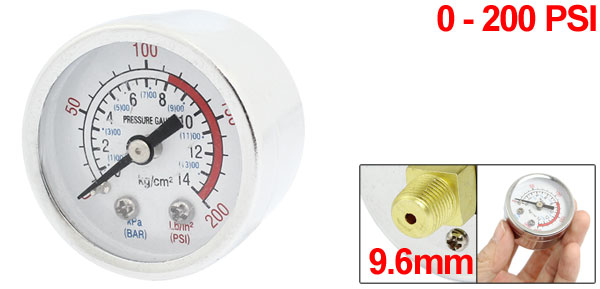 Product Name Compressor Gauge Material Metal Type Dial Type Pressure Range 0 ~ 200 PSI, 0 ~ 14Kg/cm2 Thread Diameter 9.6mm/ 0.38" Case Size (Approx) 4 x 4 x 4cm / 1.6" x 1.6" x 1.6" (L * D * T ) Color Silver Tone, Gold Tone, Red Weight 41g Package Content 1 x Compressor Gauge - Reviews