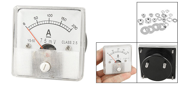 DC Current Panel Meter Model No. YS-50 Scale Range DC 0~200A Accuracy Class 2.5 Back Screw Diameter 4mm/ 0.16" & 3mm/ 0.12" Back Round Base Dia. 45mm/ 1 3/4" Panel Size 5 x 5 x 1.1cm/ 2" x 2" x 0.4" (L*W*T) Overall Depth 4.3cm/ 1.7" Color White & Black Main Material Plastic & Metal Net Weight 60g Package 1 x DC Current Panel Meter - Reviews