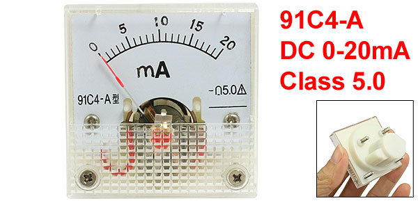 Product Name Analog Ammeter Model 91C4-A Measuring Range DC 0-20mA Accuracy Class 5.0 Meter Face Size(Approx) 4.4 x 4.4 x 0.8cm / 1.7" x 1.7" x 0.31"(L * W * T) Thread Size 0.28 x 0.8cm / 0.11" x 0.3"(Dia.*L)