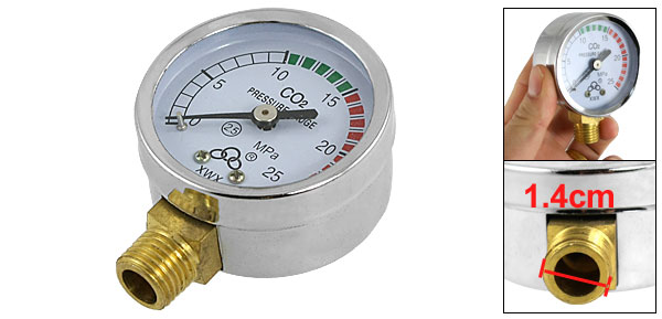 Product Name Carbon Dioxide Pressure Gauge Measuring Range 0-25 MPa Accuracy Class 2.5 Gauge Body Size 5.2 x 6.7mm / 2'' x 2.6" (D * H) Thread Diameter 1.4cm / 0.55'' Casing Material Metal Main Color Silver Tone Net Weight 74g Package Content 1 x Carbon Dioxide Pressure Gauge - Reviews