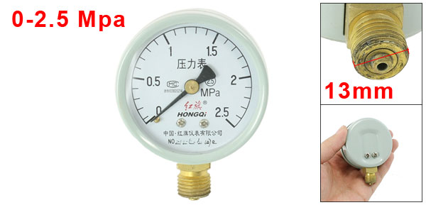 Product Name Compound Gauge Pressure Intensity 0-2.5Mpa Accuracy Class 2.5 (+/-2.5% fsd) Connector Type 13mm/ 1/4" PT Size 6 x 3.5cm/ 2.3" x 1.4" (D*T) Dial Color White Exterior Material Metal Net Weight 124g Package 1 x Compound Gauge - Reviews