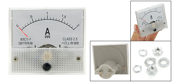 Product Name Amperemeter Panel Meter Scale Range 0-2A Accuracy Class 2.5 Main Marerial Hard Plastic Color White Back Screw Dia. 3.8mm/ 0.15" & 2.3mm/ 0.09" Panel Size 63 x 55 x 11mm/ 2.5" x 2.2" x 0.43" (L*W*T) Overall Depth 57mm/ 2.2" Weight 58g Package Content 1 x DC Amperemeter 2 x Screw Nuts 4 x Washer - Reviews