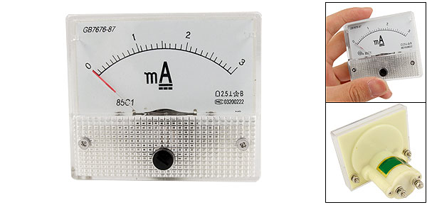 Product Name Analog Ammeter Model No. 85C1 Measuring Current Range DC 0-3mA Accuracy Class 2.5 Meter Face Size(Approx.) 6.3 x 5.5 x 1cm / 2.5" x 2.2" x 0.39"(L*W*T) Thread Size 0.28 x 0.75cm / 0.11" x 0.30"(Dia.*L) 0.28 x 1cm / 0.11" x 0.4"(Dia.*L) Overall Depth 5.6cm / 2.2" Material Plastic, Electronic Components Color White Net Weight 63g Package Content 1 x Analog Ammeter - Reviews