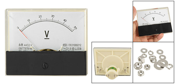 DC Voltage Panel Meter Model No. 44C2-V Scale Range DC 0~50V Accuracy Class 1.5 Back Screw Diameter 3mm/ 0.12" & 4mm/ 0.16" Panel Size 9.7 x 7.9 x 1.2cm/ 3.8" x 3.1" x 0.5" (L*W*T) Overall Depth 6.1cm/ 2.4" Color White & Black Main Material Plastic & Metal Net Weight 108g Package 1 x DC Voltage Panel Meter - Reviews