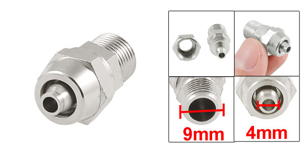 Product Name Quick Coupler Male Thread Diameter 9mm/ 0.51" Fit for Tube Inner Diameter 4mm / 0.28" Overall Size 27 x 15mm / 0.35" x 0.16"(L*Max.D) Color Silver Tone Material Metal Weight 12g Package Content 1 x Quick Coupler - Reviews