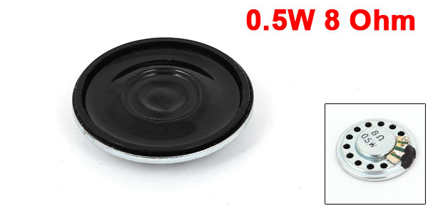 Product Name Magnet Speaker Power 0.5W Resistance 8 Ohm Type Internal Magnetic, Mini Color Black, Silver Tone Bottom Diameter 13mm/ 0.5" Diameter 27mm/ 1" Height 5mm/ 0.2"