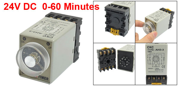 Product Name Time Relay w Base Type AH3-3 Coil Voltage 24V DC Contact Type DPDT Contact 5A 250VAC Resistive Load Time Range 0-60 Minutes
