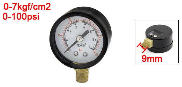 Product Name Pressure Gauge Material Metal, Plastic Type Dial Type Pressure Range 0-7kgf/cm2, 0-100psi Thread Diameter 9mm/1/8PT Total Length 57mm/2.2" Case Size (Approx) 41 x 25mm / 1.6" x 1" (D*T) Color Clear, Black, Bronze Tone Weight 54g Package Content 1 x Compressor Gauge - Reviews