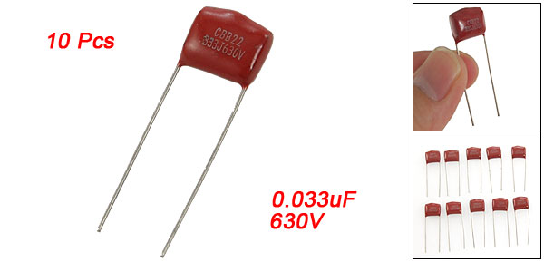 Product Name Film Capacitor Dielectric Material Metallized Polypropylene Film Model CBB22 Capacitance 0.033uF Tolerance ±5% Withstand Voltage 630V Body Size 10 x 9 x 4mm / 0.39" x 0.35" x 0.15" (L * W * T) L:ead Size 0.8 x 27mm / 0.031" x 1.06" (D * L) Lead Spacing 10mm / 0.39" Color As Picture Shown Weight 8g Package Content 10 x Film Capacitor - Reviews