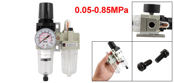 Product Name Air Source Treatment Unit Model No. AC2010-02 Working Medium Air Working Pressure Max 1.0MPa Operating Temperature 5-60°C Adjustable Pressure Range 0.05-0.85MPa Thread Port Dia 11mm / 0.433" Pressure Gauge Range 0-10kgf/cm², 0-1MPa Total Size 9 x 8 x 16cm / 3.5" x 3.1" x 6.3" (L*W*H) Main Color Clear, Silver Tone, Black Net Weight 454g Package Content 1 x Air Source Treatment Unit - Reviews