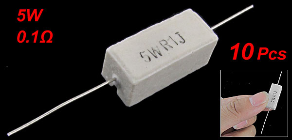 Product Name Cement Resistor Body Material Ceramic, Cement Power 5W Resistance 0.1Ω Tolerance ±5% Body Size (Approx.) 22 x 10 x 9mm/ 0.87" x 0.39" x 0.35" (L*W*H) Lead Diameter (Approx.) 0.8mm/ 0.031" Lead Length (Approx.) 24mm/ 0.94"(Max.), 18mm/ 0.7" (Min.) Color White Weight 46g Package Content 10 x Cement Resistors - Reviews