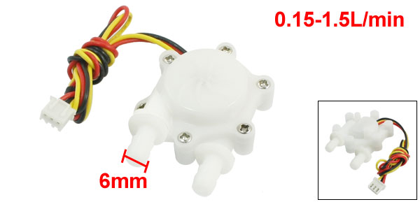 Product Name Water Flow Sensor Model SEN-HW06C Flow Range 0.15-1.5L/min Working Voltage & Current DC3V-18V, 10mA Rated Voltage DC5V Pulse Duty Factor 50 % High Level of Pulse Output >4.5V Low Level of Pulse Output <0.5V Max Pressure 0.8Mpa Insulation Performance(Min.) 100MΩ Connector Type 3Pin JST Connector Main Material POM Total Size 55 x 40 x 23mm / 2.2" x 1.6" x 0.91"(L*W*T) Outlet=Inlet Outer Diameter 6mm Cable Length 32cm / 12.6" Body Color White Weight 26g Package Content 1 x Water Flow Sensor - Reviews
