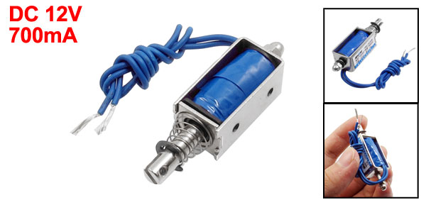 Product Name DC Solenoid Electromagnet Type MR-0630 Rated Voltage DC 12V Rated Current 700mA Action Form Push Rated Stroke 10mm, 0.1kg Body Size(Approx) 2.5 x 1.4 x 1.1cm / 0.98"x 0.55" x 0.43" (L*W*H) Cylinder Size(Approx) 3 x 0.2cm / 1.1" x 0.07" (L*D) Cable Length(Approx) 22cm / 8.6" (Each) External Material Metal, Electronic Parts Main Color Silver Tone Weight 47g Package Content 1 x DC Solenoid Electromagnet - Reviews