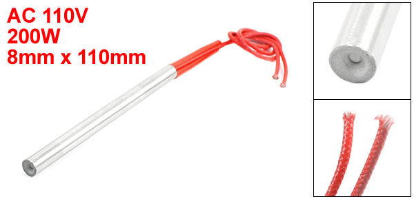 Product Name Cartridge Heater Material Stainless Steel, PVC, Nylon Rated Voltage AC 110V Power 200W Heater Size (Approx.) 8mm x 110mm / 0.31" x 4.3" (D * L) Wire Length(Approx.) 32cm / 12.6" Color Silver Tone, Red Net Weight 33g Package Content 1 x Cartridge Heater - Reviews
