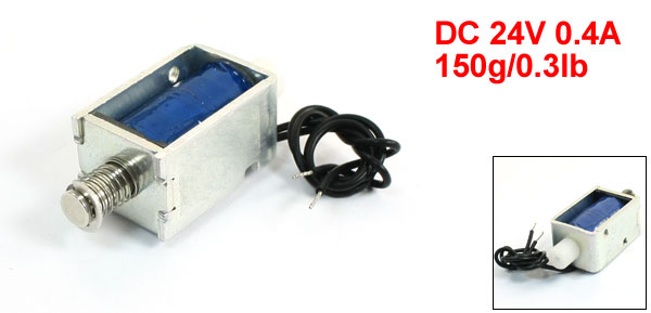 Product Name DC Solenoid Electromagnet Rated Voltage & Current DC 24V 0.4A Power 9.6W Action Form Pull Type Force 150g/0.3lb Stroke 3mm/0.12" Plunger Dia 6mm/0.24" Power On Type Intermittent 25% Max Power On Time 8 Second Body Size 19 x 16 x 30mm/0.75" x 0.63" x 1.2"(L*W*H) Cable Length 13cm/5.1" Material Metal, Electronic Parts Weight 45g Package Content 1 x DC Solenoid Electromagnet - Reviews