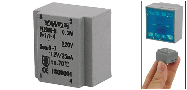 Product Name Encapsulated Transformer Model PE2006-M Insulation Grade B Working Frequency 50/60 Hz Dielectric Strength 4000V AC/1min Primary Working Temprature 220/230V + or - 10% Rated Load 0.3VA Primary 1-4, 220V Secondary 6-7, 12V/25mA Pins Number 4 Temprature Rise <=14°C Mounting Height 15.5mm/0.61" Total Size(Approx.) 2.3 x 2.2 x 2.1cm/0.9'' x 0.9'' x 0.8' (L*W*H) Color Gray Weight 26g Package Content 1 x Encapsulated Transformer - Reviews