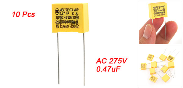 Product Name Safety Capacitor Dielectric Material Metallized Polypropylene Film Model MKP Series X2 Capacitance 0.47uF Tolerance ±10% Rated Voltage 250V AC Withstand Voltage 275V AC Body Size (Approx.) 17 x 15 x 10mm / 0.66" x 0.59" x 0.39" (L * W * T) Lead Size (Approx.) 0.8 x 27mm / 0.031" x 1.06" (D * L) Lead Spacing (Approx.) 14mm / 0.55" Color Yellow Weight 35g Package Content 10 x Safety Capacitor - Reviews
