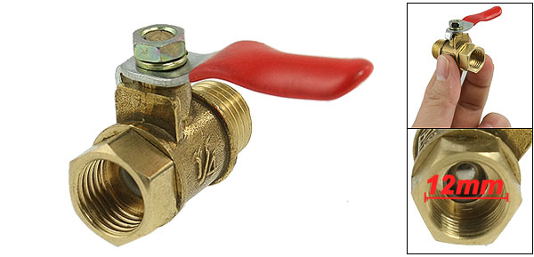 Product Name Ball Valve Thread Diameter Male: 13mm/0.51'' Female: 12mm/0.47" Ball Hole Diameter 6mm/0.24'' Level Handle Size 45 x 11mm/1.8'' x 0.43'' (L*W) Overall Size 31 x 17 x 28 mm/1.2'' x 1.1"(L* W*H) Main Color Gold Tone & Red Material Metal, Brass, Plastic Weight 31g Package 1 x Ball Valve - Reviews