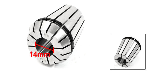 Product Name Spring Collet Model No. ER32 Clamping Range 13-14mm/ 0.51"-0.55" Clamping Diameter 14mm/ 0.55" Overall Size 32 x 40mm/ 1.3" x 1.6"(Dia*Length) Material Stainless Steel Color Silver Tone Weight 128g Package Content 1 x Spring Collet - Reviews