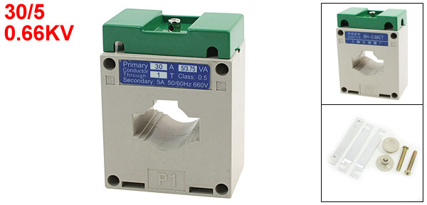 Item Name Current Transformer Model Number BH-0.66CT Rated Current Ratio 30/5 Accuracy Class 0.5 Rated Voltage 0.66KV Working Frenquency 50Hz - 60Hz Conductor Through 1T Primary Current 30A Secondary Current 5A 50/60Hz 660V Power 5/3.75VA Total Size 61 x 37 x 80mm / 2.4" x 1.5" x 3.1"(L * W * T) Case Material Plastic Color Gray, Green Weight 227g Package Content 1 x Current Transformer