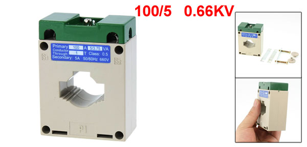 Item Name Current Transformer Model Number BHLMK-0.66 Rated Current Ratio 100/5 Accuracy Class 0.5 Rated Voltage 0.66KV Working Frenquency 50Hz - 60Hz Conductor Through 1T Primary Current 150A Secondary Current 5A 50/60Hz 660V Power 5/3.75VA Total Size 8 x 6 x 3.3cm / 3.1" x 2.4" x 1.2"(L * W * T) Case Material Plastic Color Gray Weight 228g Package Content 1 x Current Transformer - Reviews