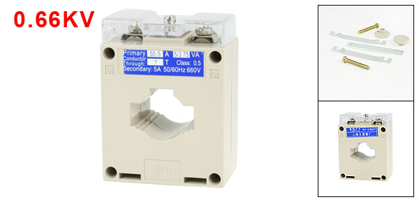 Item Name Current Transformer Model Number BH-0.66CT Rated Current Ratio 50/5 Accuracy Class 0.5 Rated Voltage 0.66KV Rated Load 5/3.75VA Rated Frequency 50/60Hz Conductor Through 1T Primary Current 50A Secondary Current 5A Total Size 8 x 6 x 3.7cm / 3.1" x 2.4" x 1.4"(L * W * T) Case Material Plastic Color Gray Weight 232g Package Content 1 x Current Transformer