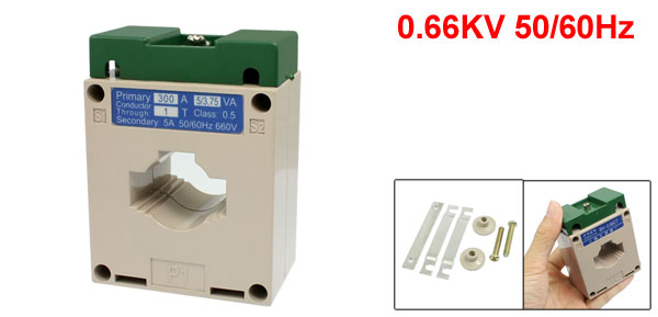 Item Name Current Transformer Model Number BH-0.66CT Rated Current Ratio 300/5 Accuracy Class 0.5 Rated Voltage 0.66KV Working Frequency 50Hz - 60Hz Conductor Through 1T Primary Current 300A Secondary Current 5A 50/60Hz 660V Total Size 8 x 6 x 3.7cm / 3.1" x 2.4" x 1.4"(L * W * T) Case Material Plastic Color Gray, Green Weight 260g Package Content 1 x Current Transformer