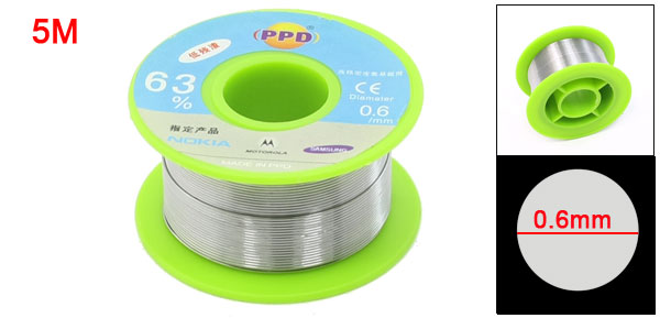 Details0.6mm Diameter 5M Long Solder Flux Soldering Tin Lead Wire Reel Core  Product Name Solder Wire Reel Material 63%SN(Tin), 37%PB(Lead) Reel Size 5.5 x 3cm / 2.1" x 1.1"(D*H) wire Diameter 0.6mm / 0.0236" Total Length 5M/16.4FT Weight 46g(wire+spool) Package Content 1 x Solder Wire Reel