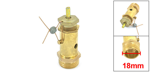 Details0.7" Male Thread Air Compressor Gold Tone Safety Pressure Relief Valve  Product Name Pressure Relief Valve Male Thread Diameter 18mm/0.7" Overall Size 65 x 18mm/ 2.6" x 0.7" (L*D) Material Brass Color Gold Tone Weight 56g Package Content 1 x Pressure Relief Valve