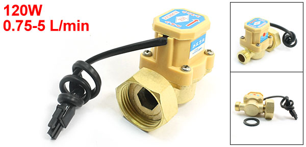 Product Name Water Flow Sensor Switch Max Load Power 120W Working Flow Rating 0.75-5 L/min Max Withstand Water Pressure <0.6Mpa Male Port Thread Dia 20mm/1/2PT Female Port Thread Dia 30mm /1PT Body Size 67 x 40 x 57mm / 2.7" x 1.6" x 2.3"(L*W) Cable Length 25cm /9.8" Material Brass Color Gold Tone Weight 180g Package Content 1 x Water Flow Sensor Switch - Reviews