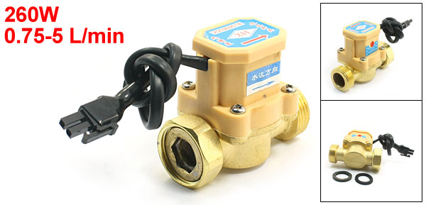 Product Name Water Flow Sensor Switch Max Load Power 260W Working Flow Rating 0.75-5 L/min Max Withstand Water Pressure <0.6Mpa Male Port Thread Dia 26mm/3/4PT Female Port Thread Dia 25mm /3/4PT Body Size 67 x 40 x 57mm / 2.7" x 1.6" x 2.3"(L*W) Cable Length 25cm /9.8" Material Brass Color Gold Tone Weight 180g Package Content 1 x Water Flow Sensor Switch - Reviews