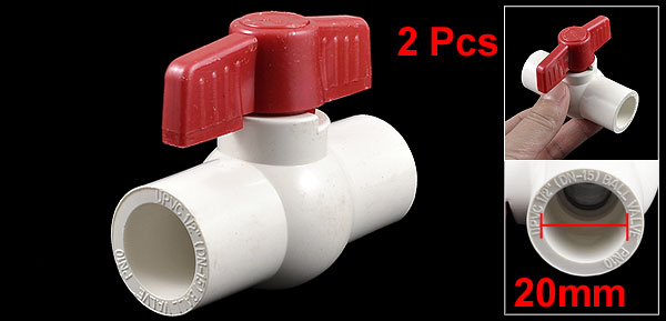 Details0.79" x 0.79" Slip Ends Two Way Ports PVC Ball Valve White Red 2 PCS  Product Name Ball Valve Ends Type Slip x Slip Slip End Size 20mm x 20mm / 0.79" x 0.79" Handle Size 6.5 x 1.8cm/ 2.6" x 0.7"(L*Max.W) Overall Size (Approx.) 7.4 x 5.5 x 5.6cm/ 2.9" x 2.2" x 2.2"(L*Max.W*H) Color White, Red Material PVC Weight 125g Package 2 x Ball Valve