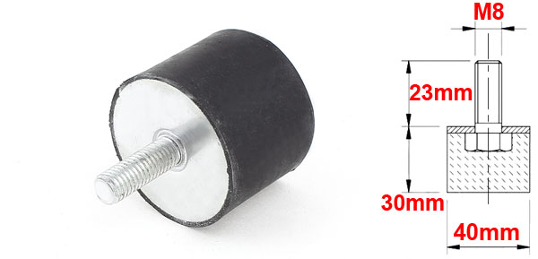 Product Name Rubber Vibration Isolator Mounts Material Metal, Rubber Thread Size (Approx.) M8 x 23mm(Dia.* L) Rubber Size (Approx.) 40 x 30mm / 1 1/2" x 1 1/8" (Dia.*H) Overall Height(Approx) 53mm / 2.1" Color Black, Silver Tone Weight 76g Package Content 1pcs x Rubber Vibration Isolator Mounts - Reviews