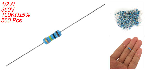 Product Name Carbon Film Resistors Rating Power 1/2W Resistance 100K Ohm Resistance Tolerance ± 5% Withstand Voltage 350V Size(Not Include Leads) 0.8 x 0.3cm / 0.315" x 0.118"(L*D) Leads Dia(Approx) 0.04cm / 0.016" Overall Length(Approx) 5.5cm / 2.2" Color See the Picture Weight 120g Package Content 500(±2%) Pcs of Carbon Film Resistors - Reviews