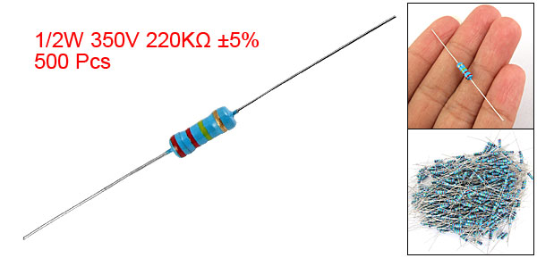 Details1/2 Watt 220K ohm 5% 4 Band Carbon Film Axial Resistors  Product Name Carbon Film Resistors Rating Power 1/2W Resistance 220K Ohm Resistance Tolerance ± 5% Withstand Voltage 350V Size(Not Include Leads) 0.83 x 0.3cm / 0.315" x 0.118"(L*D) Leads Dia(Approx) 0.04cm / 0.016" Overall Length(Approx) 5.5cm / 2.2" Color See the Picture Weight 126g Package Content 500(±2%) Pcs of Carbon Film Resistors