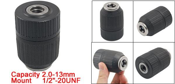 Product Name Keyless Drill Chuck Capacity 2.0-13mm Thread Mount 1/2"-20UNF Overall Size 6.3 x 4.3cm / 2.5" x 1.7"(H*Max D) Color Black & Silver Tone Material Metal, Plastic Net Weight 252g Package Content 1 x Keyless Drill Chuck