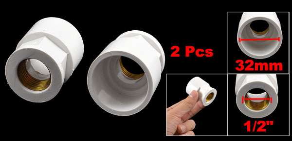 Product Name Pipe Connector Female Thread Dia (Approx.) 1/2" PT (21mm / 0.826") Overall Size (Approx.) 38 x 44mm / 1.5" x 1.7" (D*H) Inner Hole Dia 32mm/1.26" Material PVC, Brass Main Color White Weight 66g Package Content 2 x Pipe Connector - Reviews