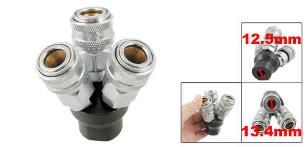 Product Name Quick Coupler Material Metal, Color Silver Tone, Black Air Outlet 3 Way Connector Diameter 13.4mm/ 0.53'' Thread Diameter 12.5mm/1/2'' Overall Size(Approx.) 64 x 70 x 85mm/ 2.5'' x 2.8'' x 3.3'' (L*W*H) Weight 327g Package Content 1 x 3 Way Quick Coupler - Reviews