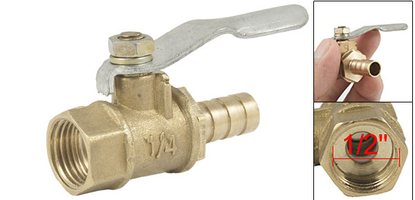 Details1/2" Female Thread to Hose Tail Connector Ball Valve  Product Name Ball Valve Thread Inner Diameter 12.5mm/ 1/2" Ball Hole Diameter 6.5mm/ 1/4" Hose Tail OD 8.2mm/ 0.32" Level Handle Size 46 x 10mm/ 1.8" x 0.4" (L*W) Overall Size 55 x 18 x 30mm/ 2.2" x 0.7" x 1.2" (L*W*H) Color Gold Tone & Siver Tone Material Brass & Metal Weight 34g Package 1 x Brass Ball Valve