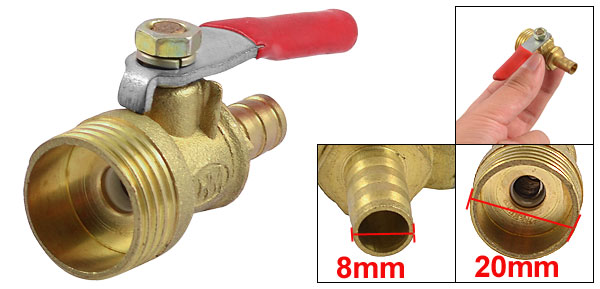 Product Name Ball Valve Thread Size 1/2 Male Thread Outside Dia 20mm Hose Tail Dia 8mm/ 0.33" Level Handle Size 48 x 10mm/ 1.9" x 0.41" (L*W) Total Size 58 x 20 x 32mm/ 2.3" x 0.8" x 1.2" (L*W*H) Color Brass Tone, Red, Silver Tone Material Solid Brass Weight 39g Package 1 x Ball Valves - Reviews