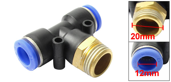 Product Name Pneumatic Quick Fittings Type T Connector One Touch Connector 12mm Male Thread Connector 20mm Thread Size 1/2" PT Material Plastic, Metal Dimension (Approx) 5.9 x 4.4 x 2.2cm/ 2.32" x 1.73" x 0.86" (L*W*T) Color Black, Blue Weight 40g Package Content 1 x Pneumatic Quick Fittings - Reviews