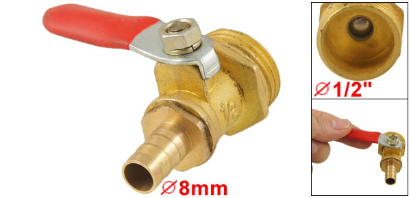 Product Name Ball Valve Male Thread Diameter 1/2" NPT Ball Hole Diameter 6mm/ 0.24" Hole Tail OD 8mm Level Handle Size 44 x 11mm/ 1.7" x 0.43" (L*W) Overall Size 45 x 42 x 30mm/ 1.77" x 1.65" x 1.18"(L* W*H) Main Color Gold Tone & Red Material Metal, Brass, Plastic Weight 36g Package 1 x Ball Valve - Reviews